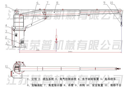 軟管吊機主要由底座、塔身、吊臂、液壓絞車、變幅油缸、回轉(zhuǎn)機構(gòu)、液壓系統(tǒng)、維修平臺、操縱臺、電氣控制箱、遙控器等部分組成。